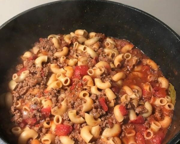 Cook the macaroni al dente according to package directions. While it’s cooking, put the ground beef and onion in an extra-large skillet and brown them over medium heat. When done, drain off the fat and season with spices.