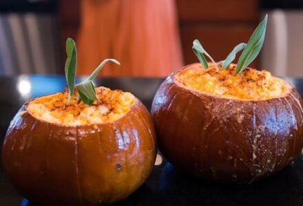 This makes a very pretty addition to your Thanksgiving table. The small pie pumpkin can be cleaned out and set aside the night before. The corn pudding…