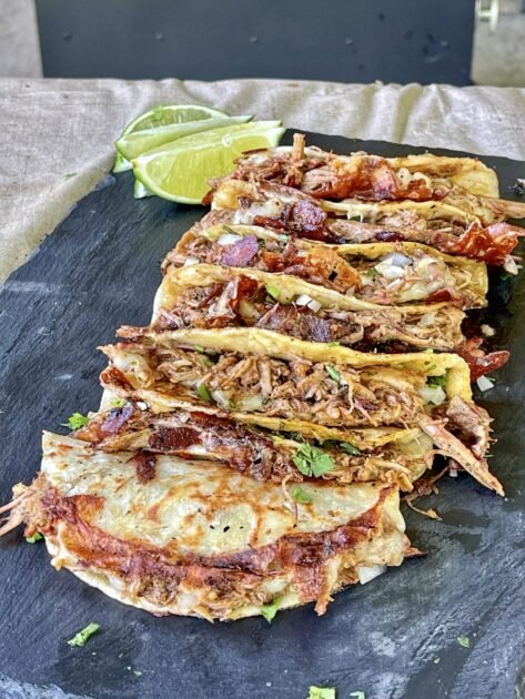 • Heat up your griddle or cast iron skillet and add a tablespoon of vegetable oil and let heat. Place your white corn tortillas in and toast for 45 seconds, flip and add the mozzarella cheese and topped with pork. Close the taco and flip 30 seconds later. You want to make sure the outsides are nice and toasty. Make all of your tacos and place them on a side dish.