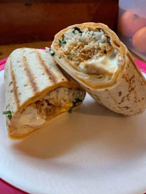 Step 8: To assemble the quesaritos, top each with rice, meat, nacho cheese sauce, and sour cream, then roll to make a burrito. Do this process to the rest of the ingredients.
