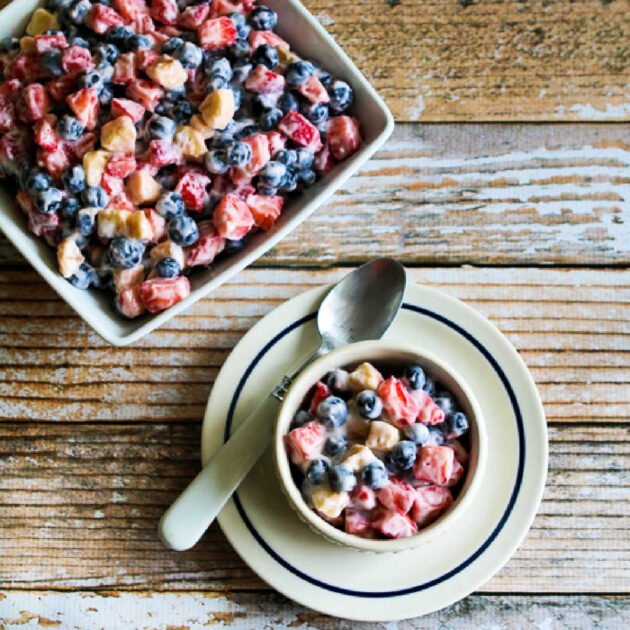 Salads with fruit won’t ever be super low in carbs, but this Red White and Blue Salad might work for some low-carb eaters for a special occasion. You can make it lower in carbs by using even a smaller amount of banana or trying the tip to substitute jicama cubes for banana. Blueberries and strawberries are relatively low-glycemic as far as fruits go, but this Red White and Blue Salad is still probably Phase 3 for the original South Beach Diet.