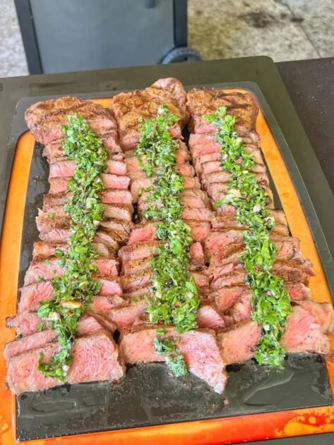 6. After resting, you can slice all the steaks into thin cuts and dress with the Roasted Garlic Chimichurri or you can serve the steaks whole on a plate to your family (or guest) with a little bowl of the chimichurri on the side.