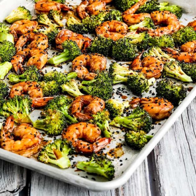 I thawed them out on a day when I was testing recipes with my niece Kara, and we came up with this shrimp and broccoli combination that includes a slightly-spicy glaze with Asian flavors. And this one-pan dinner was so delicious and it’s perfect for a special treat when you’re trying to really limit carbs; I hope you’ll try it if you’re a fan of these flavors.