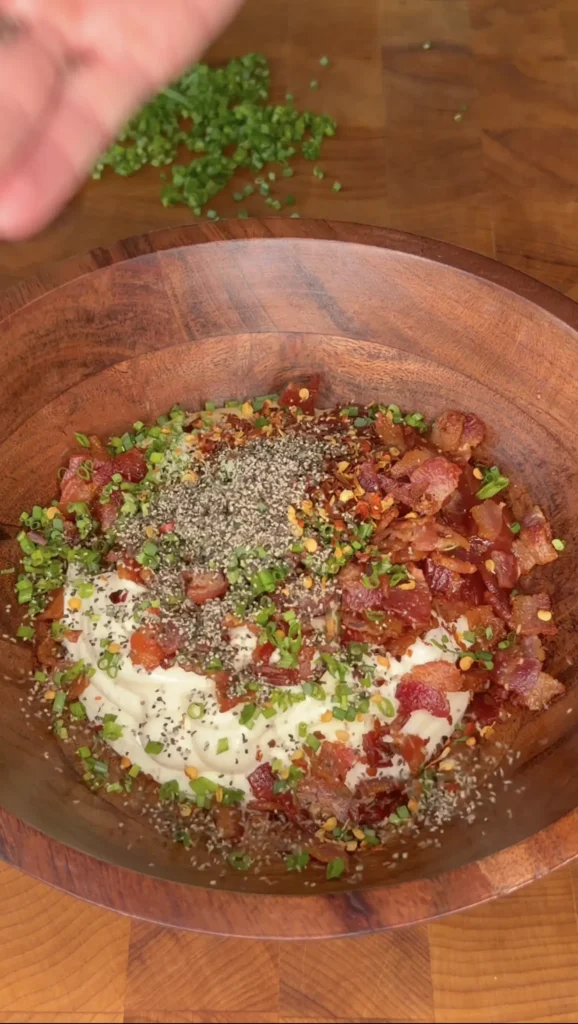 Mix thoroughly until all ingredients are evenly distributed. The bacon should be suspended throughout the mayo rather than clumped. Taste and adjust seasoning if needed.