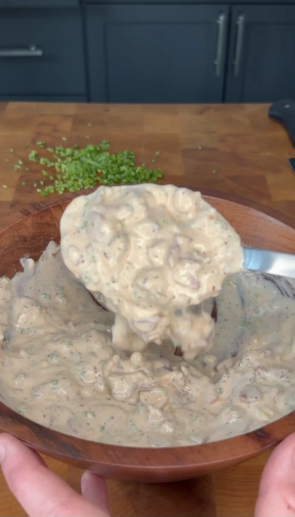 The baconnaise combines 1 cup mayonnaise with ¾ cup finely chopped cooked bacon, Dijon mustard, Worcestershire sauce, and black pepper. The bacon pieces add smoky, salty crunch. The mayo creates creamy base. You make it ahead and refrigerate. The caramelized onions cook in cast iron on the smoker at 275°F to 300°F for 45 to 60 minutes. You stir them every 10 to 15 minutes until jammy and sweet.