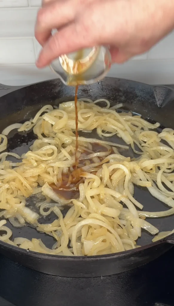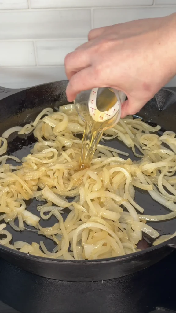 The cast iron skillet on the smoker provides consistent heat similar to stovetop cooking. Cast iron retains and distributes heat evenly. The onions cook gradually in butter and olive oil. The fat prevents sticking and adds richness. The smoker’s ambient temperature (275°F to 300°F) is perfect for caramelization without burning.