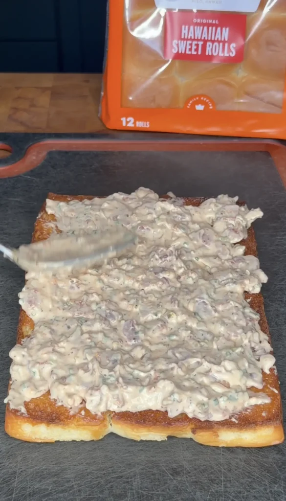 Place the top layer of Hawaiian rolls over the baconnaise. Press down gently to compress slightly.