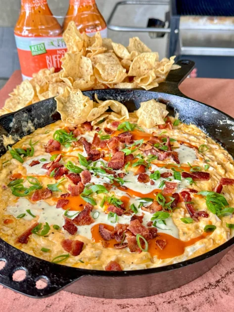 Remove the cast iron and place it on a warmer and top it with more buffalo sauce, ranch sauce, Scallions, and crispy bacon. Serve it with tortilla chips, I like using the scoopers.