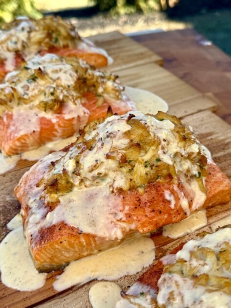 Make the Garlic Lemon Sauce (Optional): While salmon is smoking, melt butter in a heat-safe dish with heavy cream, garlic paste, lemon zest, and Tony’s Creole seasoning. Stir until combined.