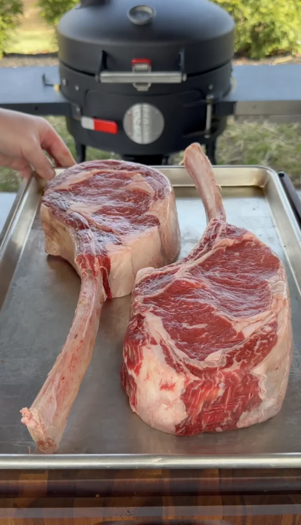Thickness matters more than weight. Your tomahawk steaks should be at least 2 inches thick for this sear-and-smoke method. Thinner steaks will overcook during the smoking phase before the interior reaches the target temperature. Most tomahawks weigh between 2 and 2.5 pounds each, which includes the bone weight.