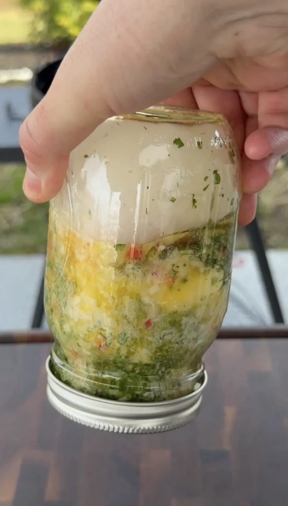 Combine the softened butter, minced garlic, diced Fresno pepper, honey, lemon juice, kosher salt, black pepper, and chopped parsley in a heat-safe mason jar. Leave 1 to 2 inches of space at the top of the jar. Stir gently to distribute the ingredients without fully mixing.