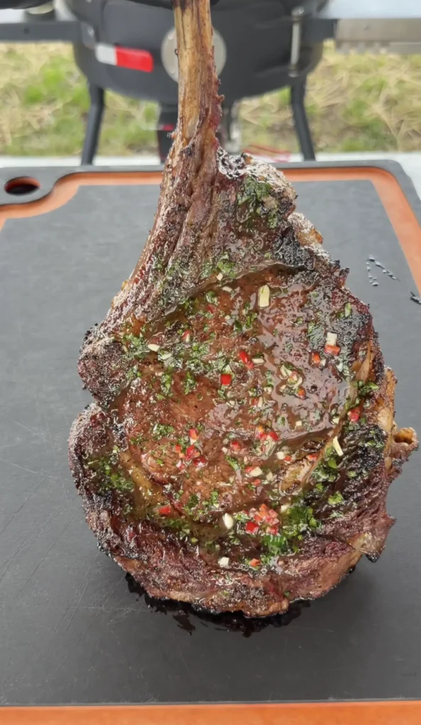 During cooking, the heat drives moisture toward the center of the steak. Resting allows that moisture to redistribute evenly throughout the meat. For a 2-inch-thick tomahawk, 10 minutes is the minimum rest time. You can go up to 15 minutes without the steak cooling too much, especially if you spoon the coal-smoked butter over the top while it rests. The butter melts into the crust and keeps the surface warm.