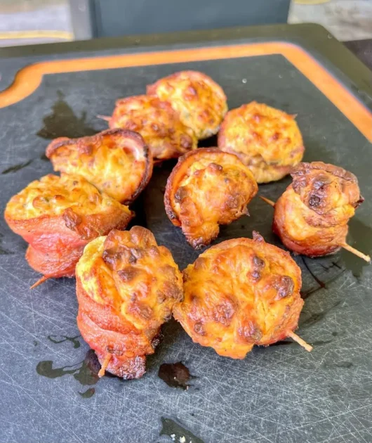 6. Place onto the smoke, you want the pig shots to be on a flat even surface so they don’t fall over while they smoke. Smoke for 30 minutes and check them, then at the 45 minute mark. The bacon should be tightened up and rendered to a crisp and the cream cheese topping should have a beautiful golden brown.