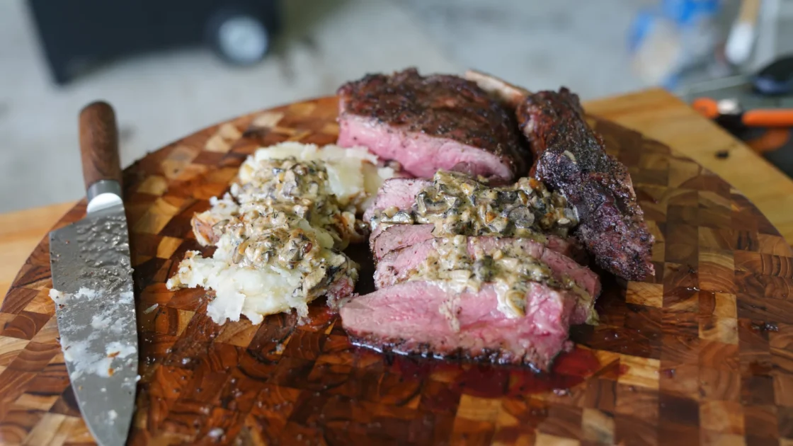 • Let the steak rest for 10 mins and check the potatoes, they are done at 195 degrees. Once the potatoes are done remove them and cover under foil in a plate and sear your steaks off for 60-90 seconds per side. Remove and let rest for 10 mins.