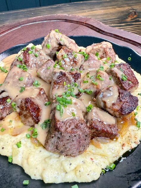 • Assemble the dish with mashed potatoes as the base, steak bites on top, and a drizzle of gravy. Garnish with caramelized onions and chopped chives. Serve warm and enjoy!