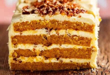 A Pumpkin Layer Cake with Cream Cheese and Toffee Pecans