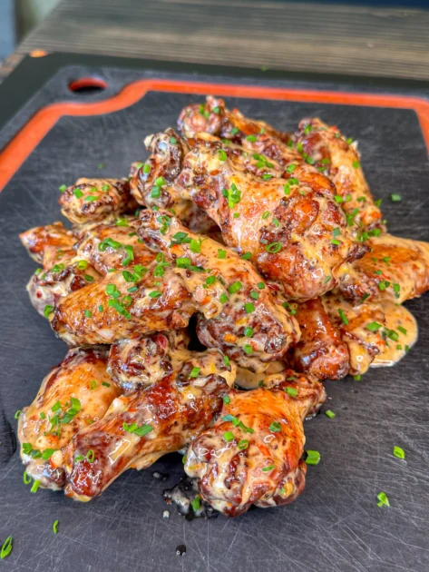 To make these special wings, you need to follow a few steps. First, you prepare the Bang Bang Sauce by mixing all its ingredients. Then, you smoke the chicken wings. This means you cook them with wood smoke to give them a deep, smoky flavor. After they’re smoked, you fry the wings in hot oil. This makes them crispy. The last step is to pour the sauce over the wings and mix them so they’re fully covered. Add some chives on top, and they’re ready to be enjoyed.