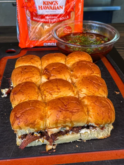 While the beef is cooking, preheat your smoker to 350 degrees Fahrenheit. Slice the Kings Hawaiian rolls in half horizontally, but keep them connected. Put them on a baking sheet. Layer Oaxaca cheese on the bottom half of each bun. When the beef is ready, shred it and pile it on top of the cheese. Add more slices of Oaxaca cheese on top of the beef.