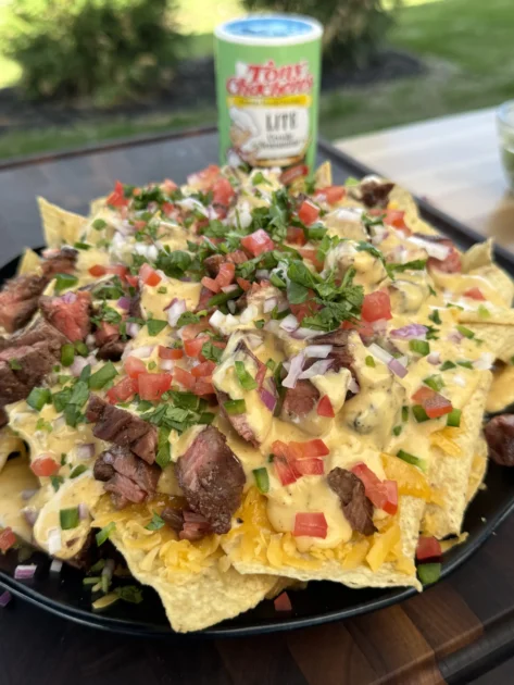 Spread a generous layer of tortilla chips in a cast iron skillet or on an oven-safe tray. Drizzle some of the cheese sauce over the chips, then layer on the sliced skirt steak, diced tomatoes, onions, and jalapeños. If grilling, place the skillet on indirect heat at around 375°F for 5–7 minutes. This step helps warm everything through and slightly crisp up the chips. You can also broil them in the oven for 2–3 minutes if you don’t have a grill.