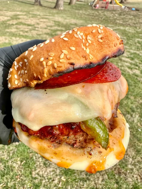 Pizza is great on its own and the famous cheeseburger is fantastic, let’e combine them into one. The buns got toasted and then slathered with a roasted garlic butter for a savory note. While the burger is grilling I topped it with pizza sauce and then a slice of provolone cheese that gets topped with two deli sized pepperoni slices fresh off the griddle. When it all gets assembled together the final results are as impressive as it sounds!
