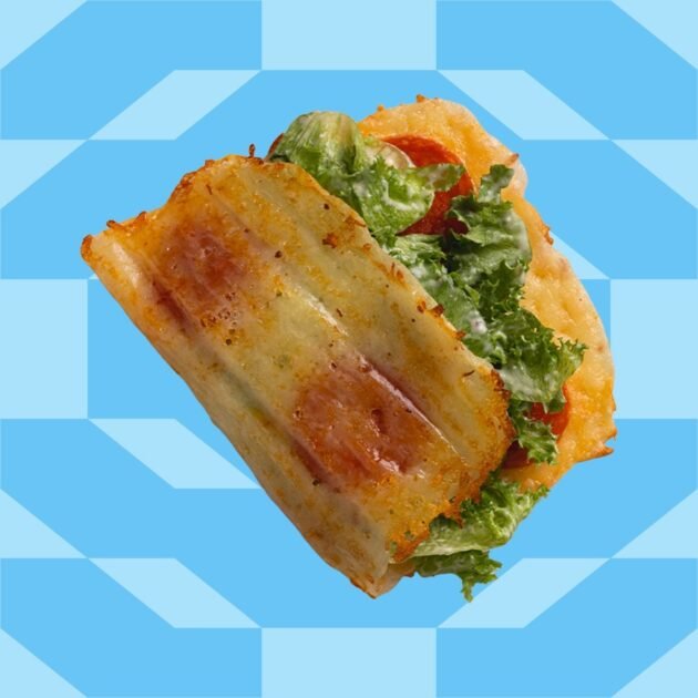 Carefully lift one side of the cheese parchment and fold the “shell” over the salad, rolling it into a wrap. Serve it immediately while the cheese is still warm and the salad is crisp.