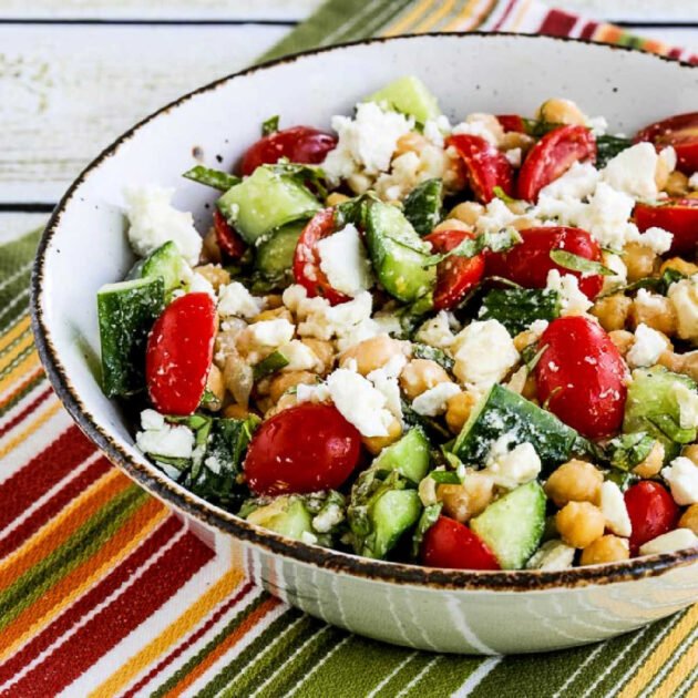 This recipe for a great side dish salad with cucumbers, tomatoes, chickpeas, and FEta was first posted in 2006. It was updated in 2018 with better photos, and was last updated with more information in 2024.
