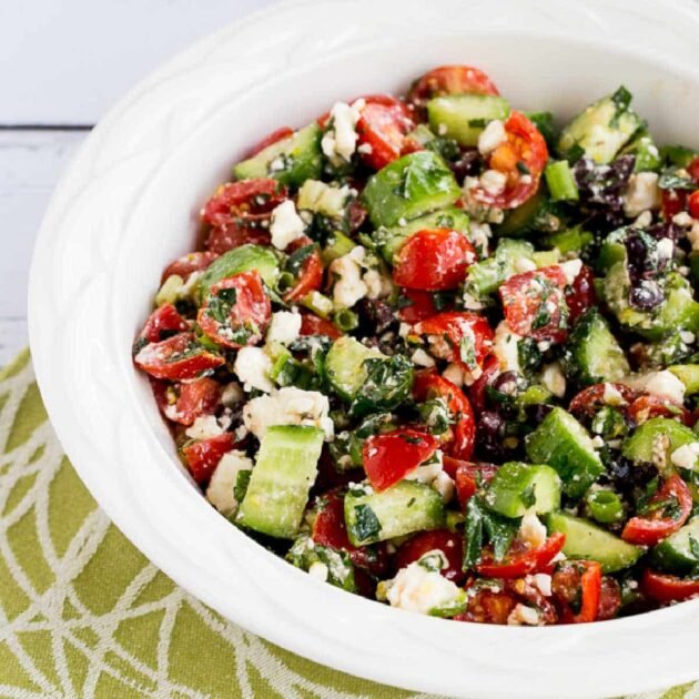 This Tomato Cucumber Salad is a good side salad for any low-carb diet, or for any phase of the original South Beach Diet. Tomatoes do have some carbs, so if you’re strictly limiting carbs you might want to use more cucumbers and fewer tomatoes.
