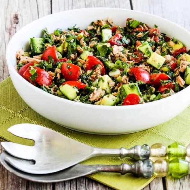 This Tuna Salad with Cucumbers, Tomatoes, Parsley, and Mint is a great dish for low-carb diet plans including Keto, and also for any phase of the original South Beach Diet. The tuna in olive oil may be high in fat for South Beach, so if you’re being strict about that you might want to use water-packed tuna.