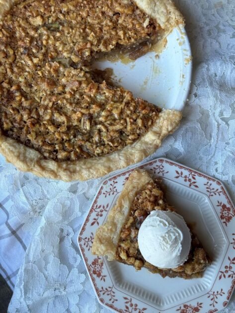 This pie is wonderful the way it is, but you could always switch out the extract to rum extract, or add bourbon to this pie too. This is made with English Walnuts and you could use Black Walnuts. It will be a different taste as black walnuts are very strong. We make our own pie crust but you can easily buy the roll out kind from Pillsbury to save time in the kitchen!